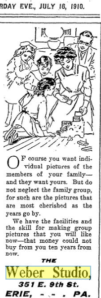 F.W. Weber was a local photographer and specialized in portraits (family portraits and weddings). According to A History of Erie County PA: “F. William Weber grew up in Erie and after receiving his education was employed by his brother, F. J., who was a well known photographer of Erie. When he was 21 years old Mr. Weber purchased his brother’s interest in the business, which is located at 351 East 9th Street, and is now conducted by his son, H. J. Weber. Mr. Weber has been considered the leading photographer of the city for many years and is an artist in his work. He also has an interest in the Erie Picture and Framing Company.” The studio (Weber Studio) was in a building adjoining the family home (with the address 351 E 9th). He was also the Vice President of the Parade Street Market Association, which was a large building with an open air farmer’s market located at 915-931 Parade Street and was in business from 1895 until the 1960s. Helen died in 1934 and F. W. in 1946.