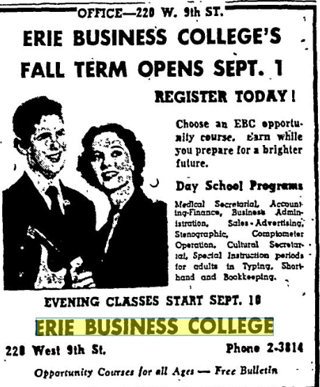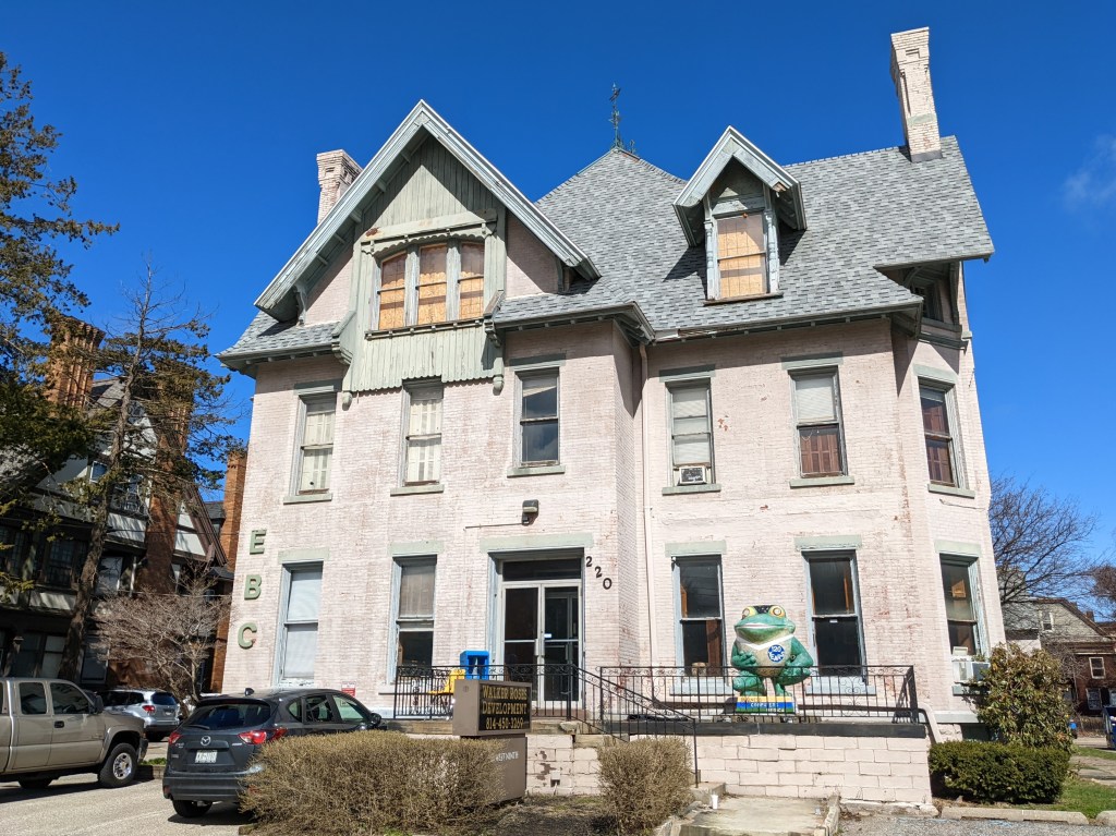 The home at 220 W 9th was then occupied for only a couple of years by Neilsen Streuber, of a prominent local leather manufacturing family, when it was eventually sold to the Knights of Malta and the Church of Divine Science in 1923 to house their “club house.” By the 1940s the building became occupied by Erie Business College which was founded in 1884 and was run, until recently, as Erie Business Center (the home at 220 W 9th being a part of their campus which eventually included the building at 246 W 9th – built in 1969) and which closed permanently in 2014. The home was purchased in 2016 by DTW Development LLC (the sign in front of the property states ‘Walker Rose Development’) and it appears to be apartment rentals.