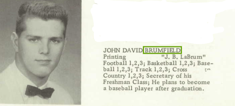 In his youth, John Brumfield was a standout baseball pitcher (who pitched a 7 inning 1 hitter against Strong Vincent, setting a long standing record, in his freshman year) and football Quarterback for Tech Memorial. He played for All Star Leagues and was a local high school baseball phenom (his name was in the papers constantly for his outstanding pitching prowess). He continued to play baseball as an adult for different local leagues. John and Loretta were married in 1964, they had a son, Tommy, who passed away at 2 years old. They went on to have three more children. Upon selling the home in 1981, the Brumfields moved to Texas.