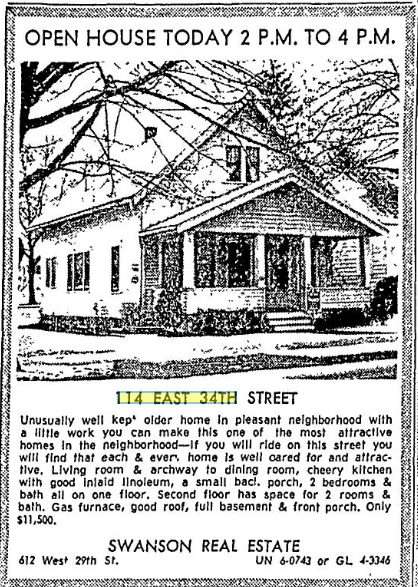 The bungalow at 114 E 34th Street was my childhood home, where I grew up, in the neighborhood of my youth. I have strong memories of playing in Baker’s Field behind my backyard, walking to Jefferson School playground with my cousins and neighborhood friends, hosting our annual “Don’t Let the End of Summer Be A Bummer” picnics in the huge backyard (which was essentially an entire un-built lot), riding my bike past the mansions of Glenwood Hills nearby, venturing into the woods by Mill Creek off Eliot Road. The home held many memories of the time my family owned it (from 1981-2007) and my mother has asked me numerous times to figure out its history. So for my mom, Pam, on Mother’s Day, here is what I came up with.